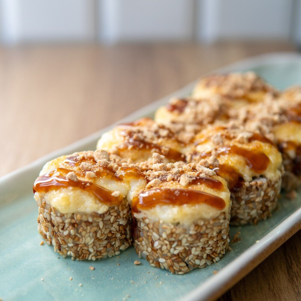 Сыр сливочный, креветка, авокадо, кунжут, сырный замес, соус терияки, кешью