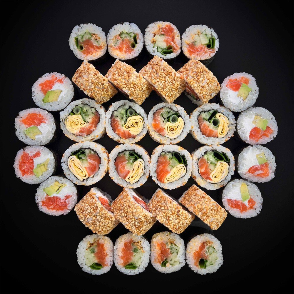 Ролл с блинчиком и лососем, ролл с копченым лососем и шиитаке, ролл с лососем и авокадо, ролл с копченым лососем